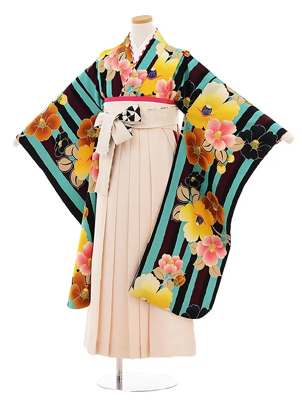 小学生卒業式袴レンタル9476紅一点ターコイズストライプ椿×クリーム色袴