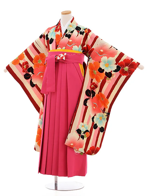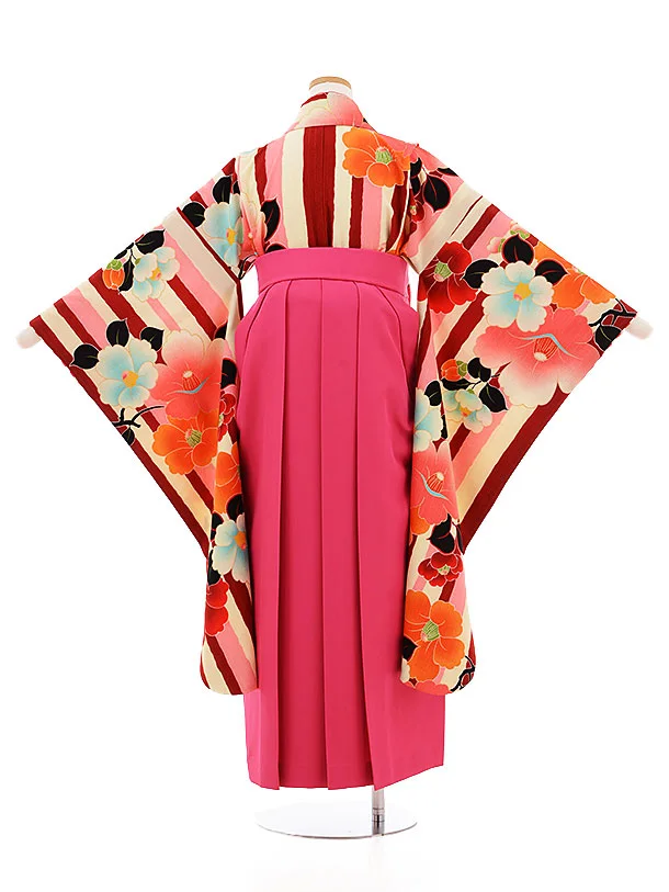 小学生卒業式袴レンタル9487紅一点ピンクストライプ椿×ピンク袴