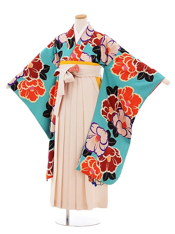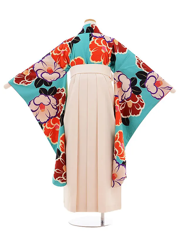 小学生卒業式袴レンタル9499九重ターコイズ椿×クリーム袴