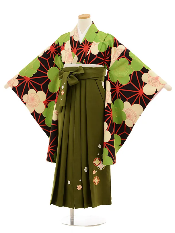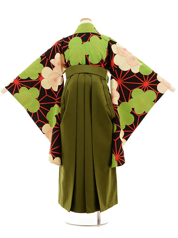 小学生卒業式袴レンタル(女の子)9529 黒地麻の葉梅×抹茶色袴