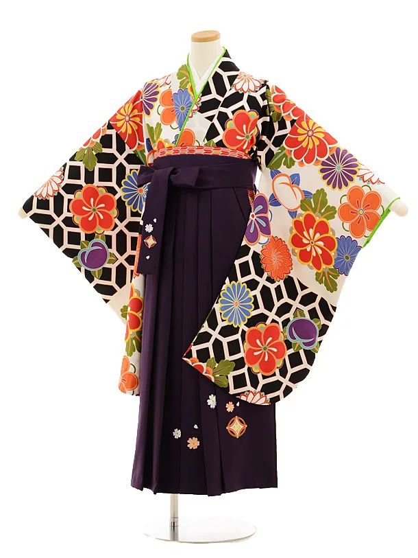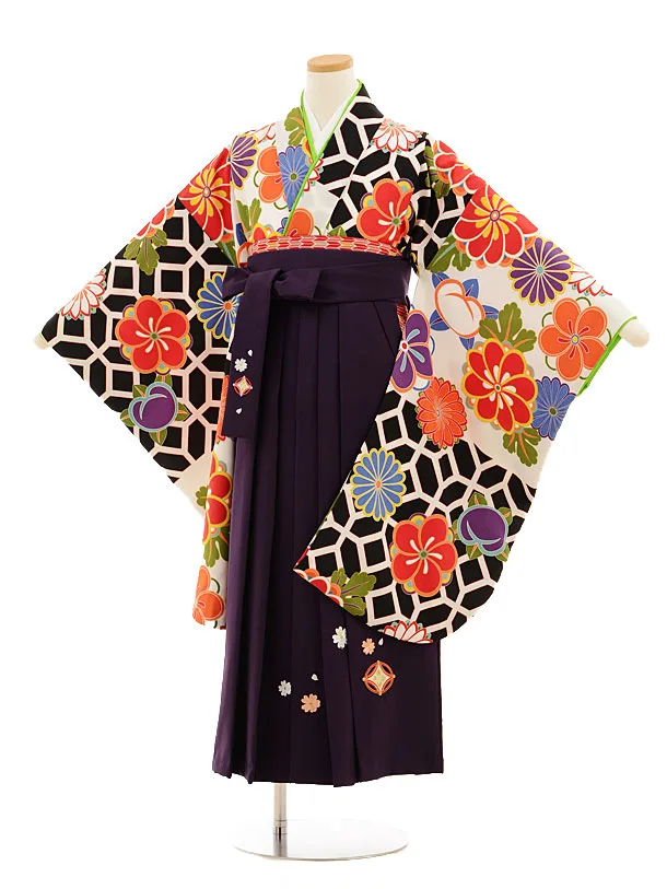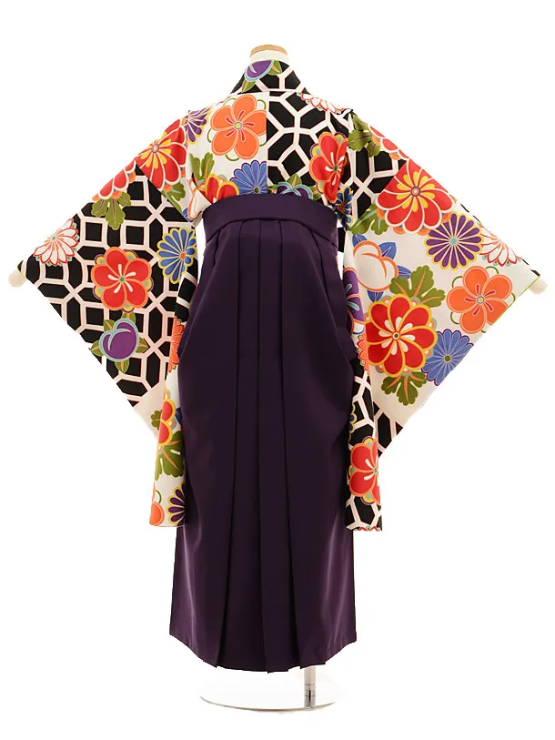 小学生卒業式袴レンタル(女の子)9532白地菊梅×パープル袴