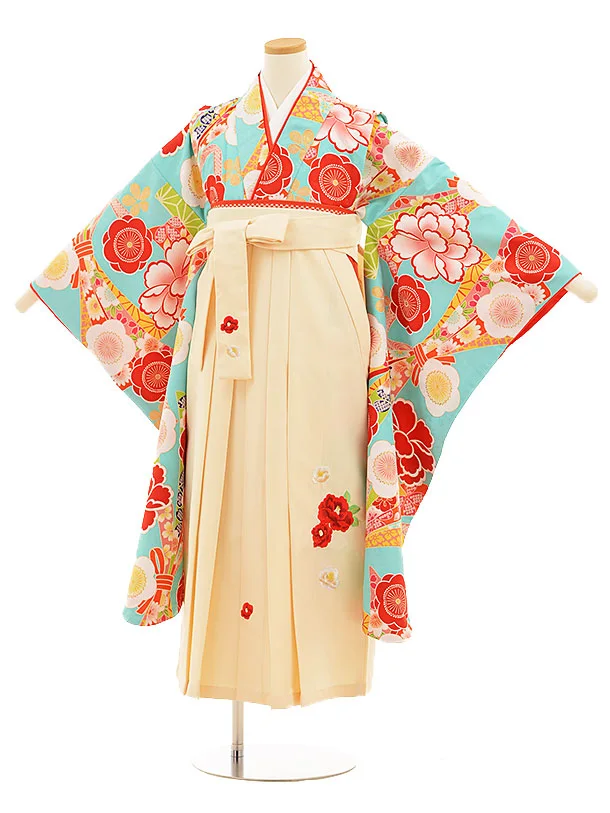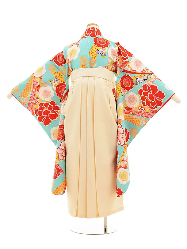 小学生卒業式袴レンタル(女の子)9535小町kidsターコイズ花×クリーム袴