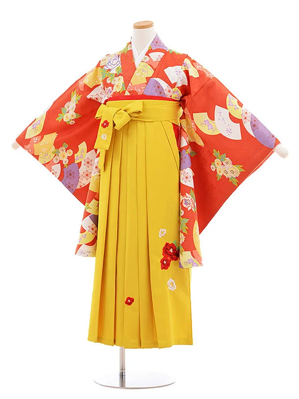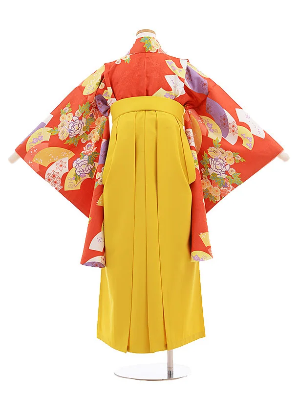 小学生 卒業式 袴レンタル(女の子)9585赤茶扇花×イエロー袴