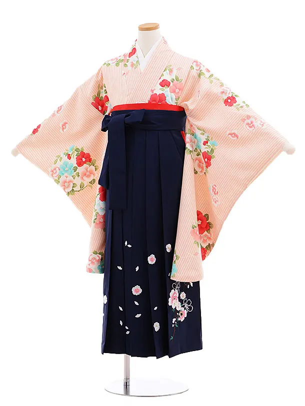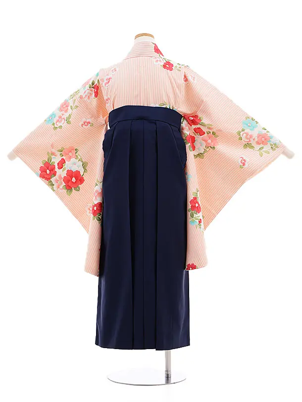 小学生卒業式袴レンタル(女の子)9601ピンクストライプ椿×紺袴
