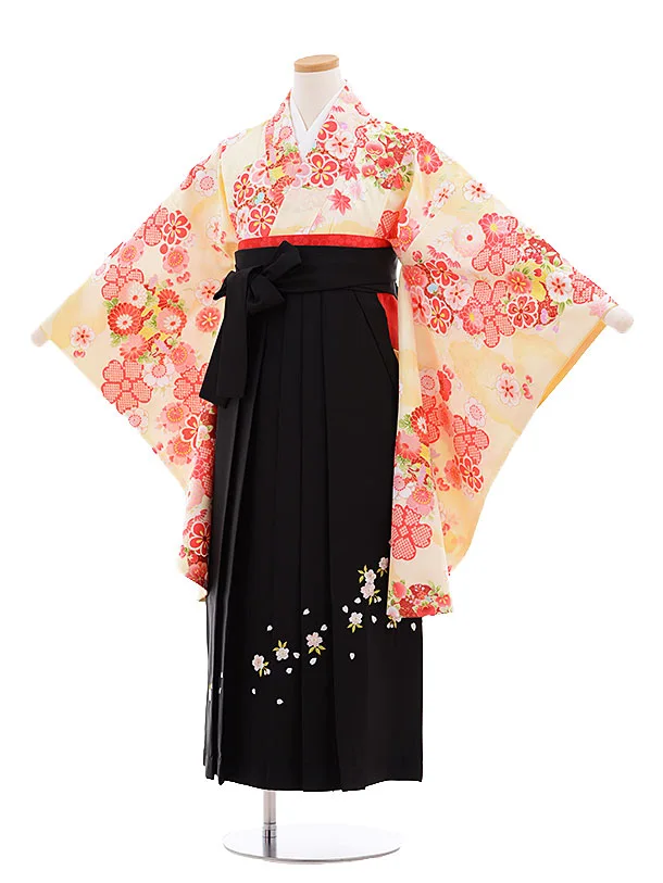 小学生 卒業式 袴レンタル(女の子)9630クリーム色雲取り花×黒袴