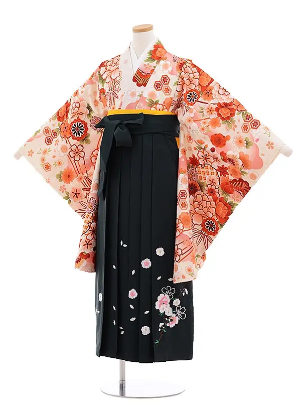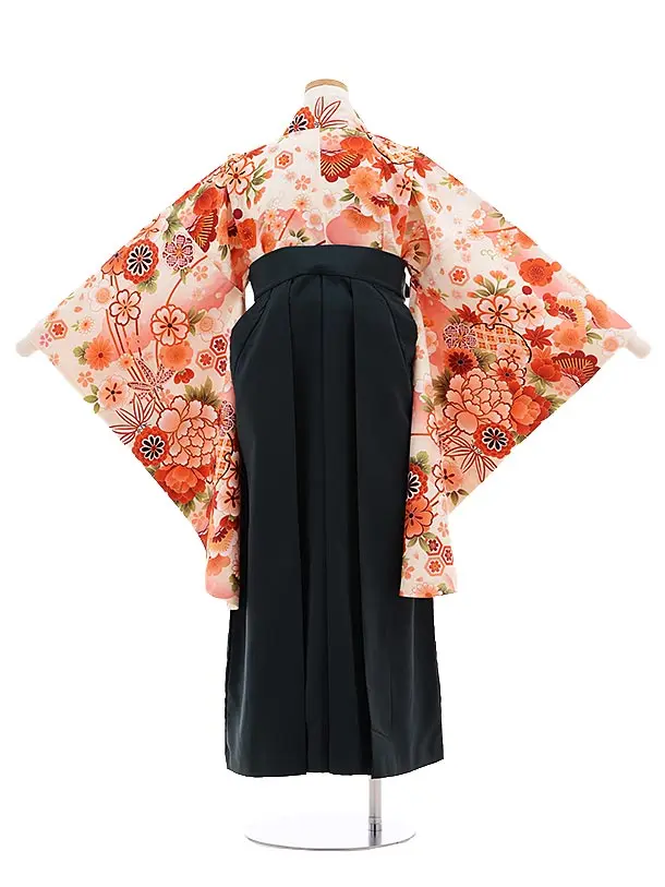 小学生卒業式袴レンタル(女の子)9640クリーム色松竹梅ぼたん×深緑袴