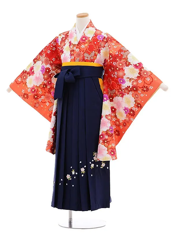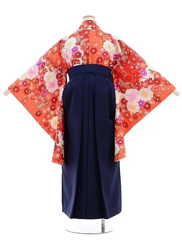 小学校卒業式袴レンタル(女の子)9642オレンジ花づくし×紺袴