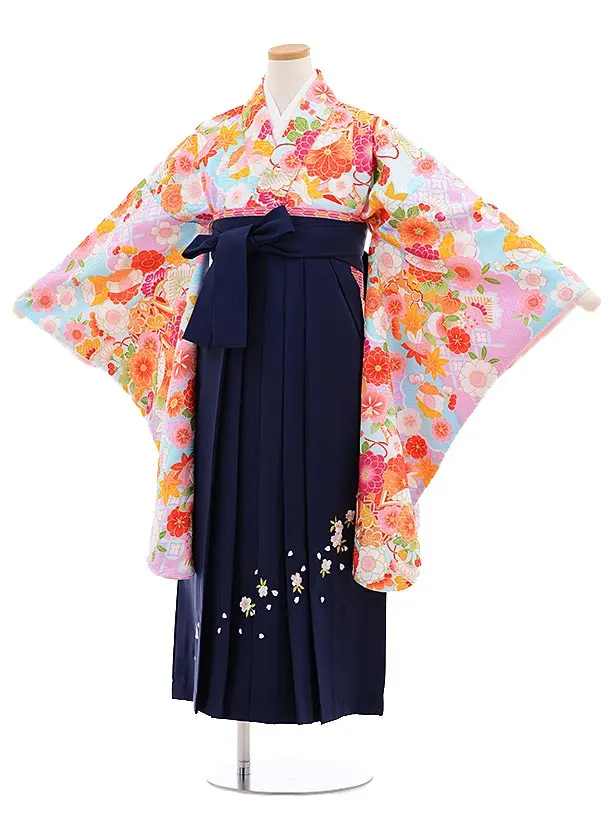 小学校卒業式袴レンタル(女の子)9657水色地雲取花×紺桜袴