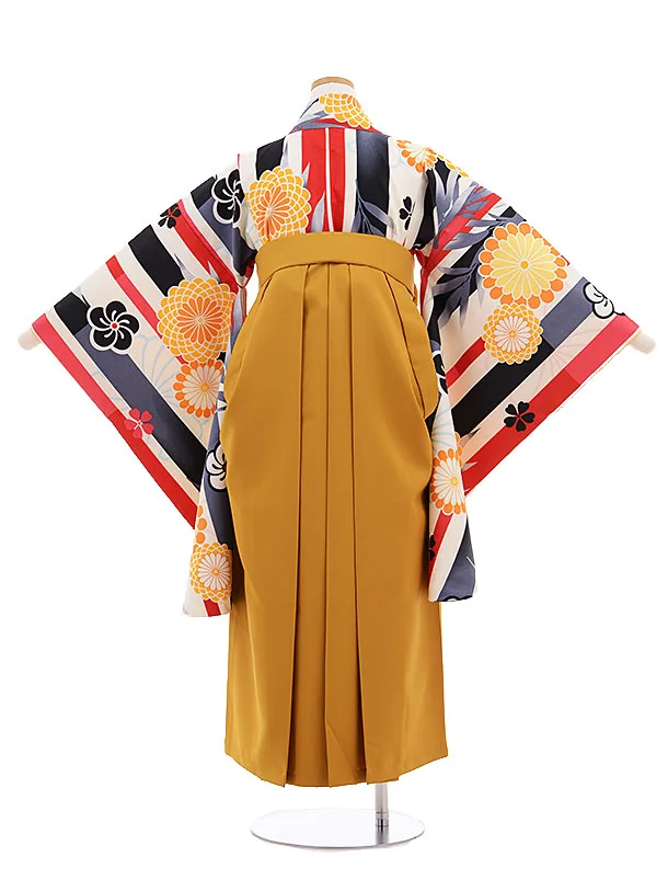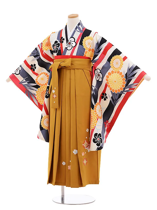 小学校卒業式袴レンタル(女の子)9658白地ストライプ菊×金茶袴
