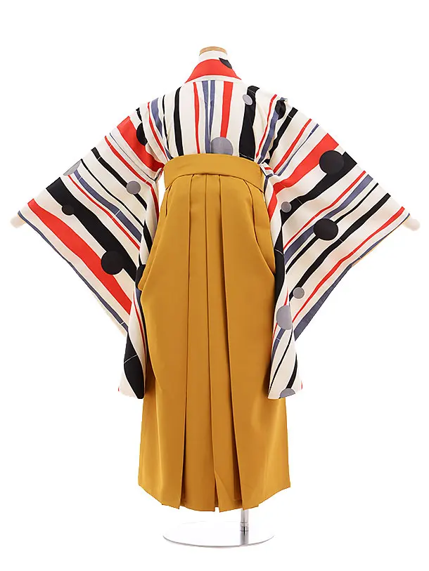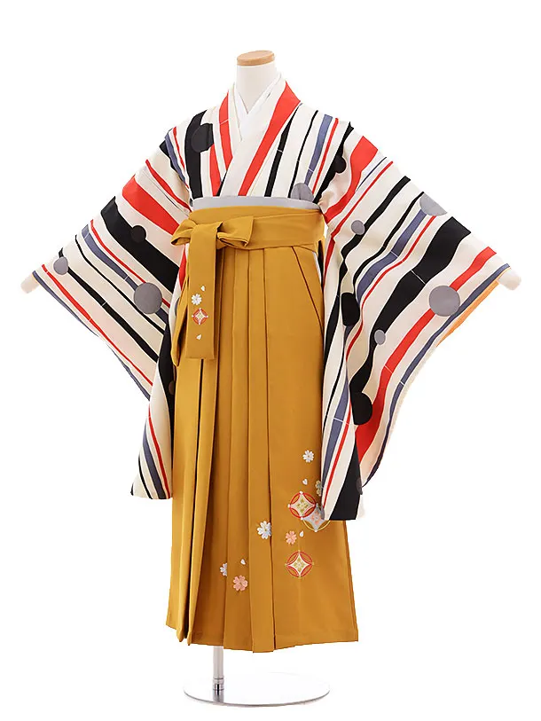 小学校卒業式袴レンタル(女の子)9690白黒ストライプ水玉×金茶袴