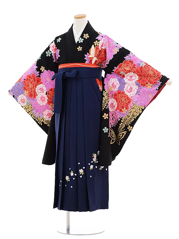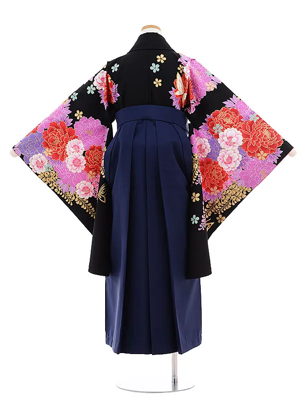 小学校卒業式袴レンタル(女の子)9705黒地ぼたん蝶×紺桜袴