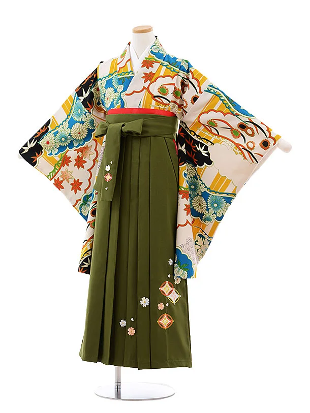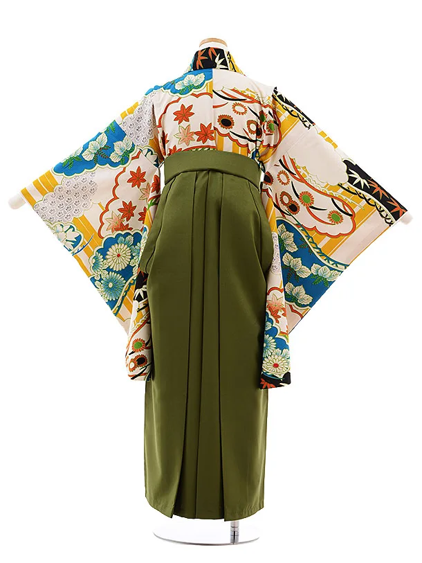 小学校卒業式袴レンタル(女の子)9792 ベージュ地古典×抹茶袴