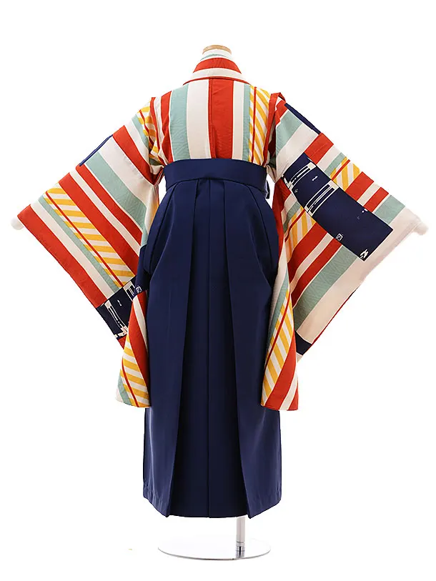 小学校卒業式袴レンタル(女の子)9798 クリーム地モダンストライプ×紺袴