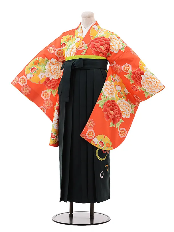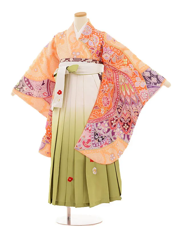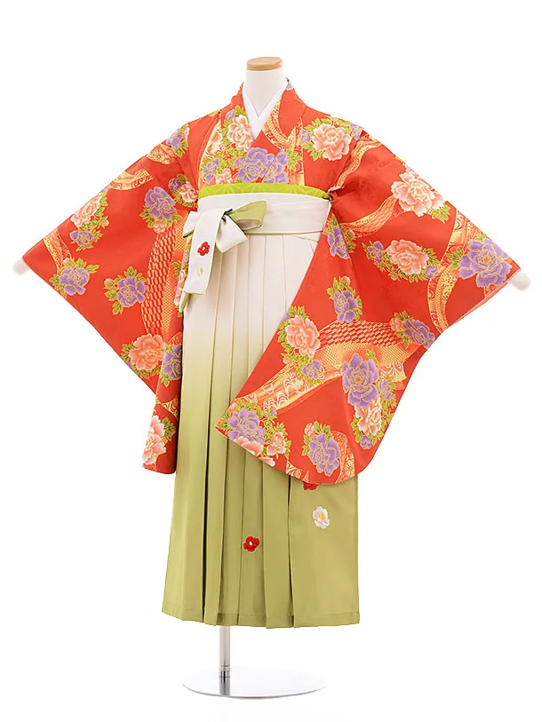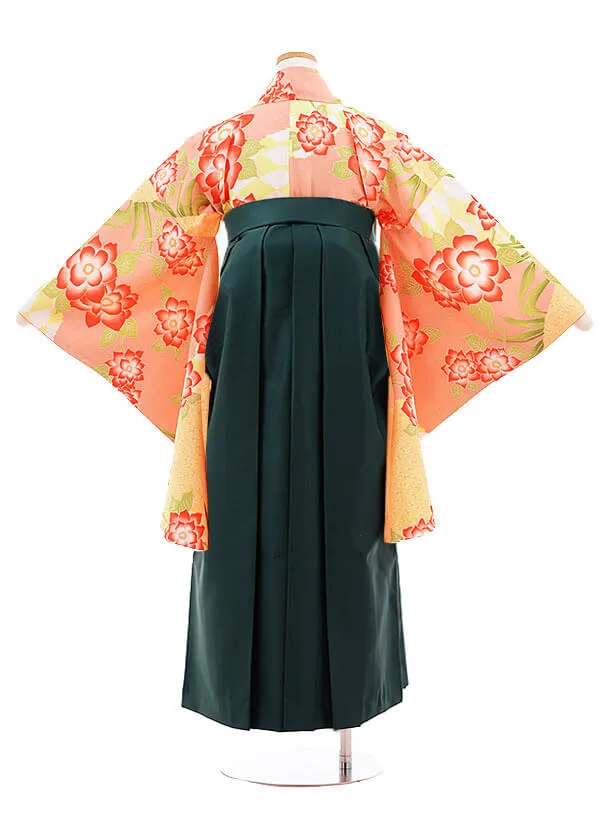 小学校卒業式袴レンタル(女の子)9864サーモンピンク花×グリーン袴
