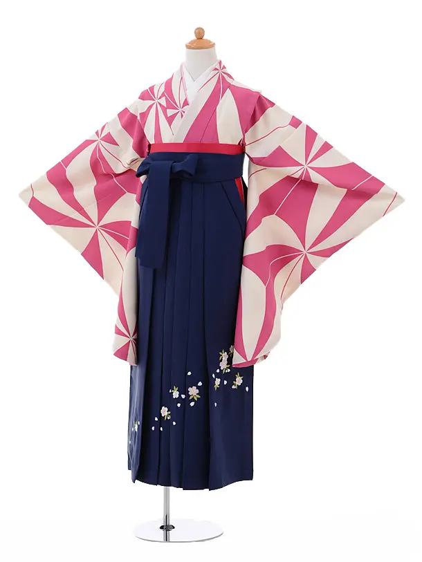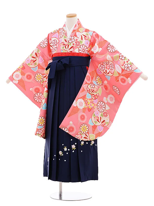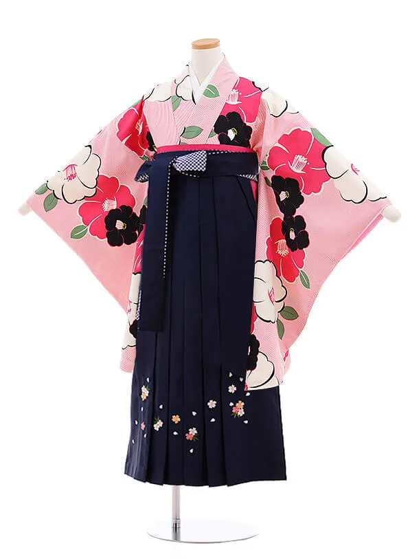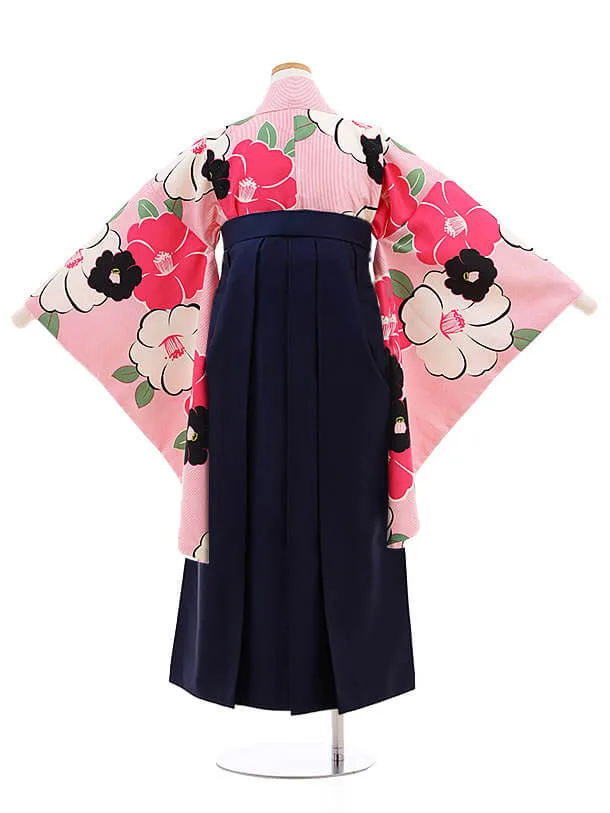 小学校卒業式袴レンタル(女の子)9865ピンクストライプ椿×紺袴