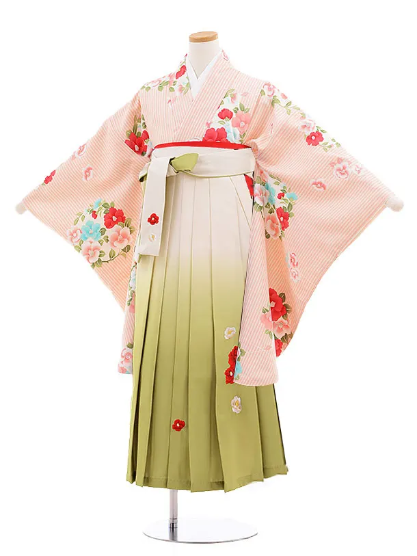 小学校卒業式袴レンタル(女の子)9867 ピンクストライプ椿×白グリーン袴