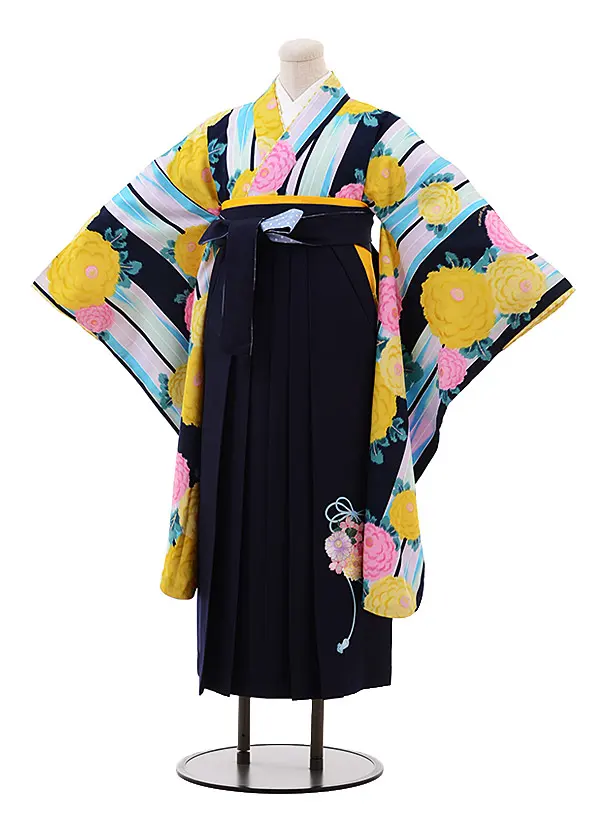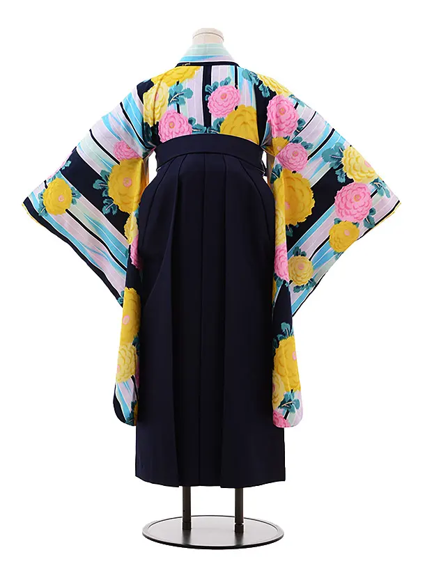 小学生 卒業式 袴 女児 9914 ポンポネット 黒地ストライプ 花×紺袴