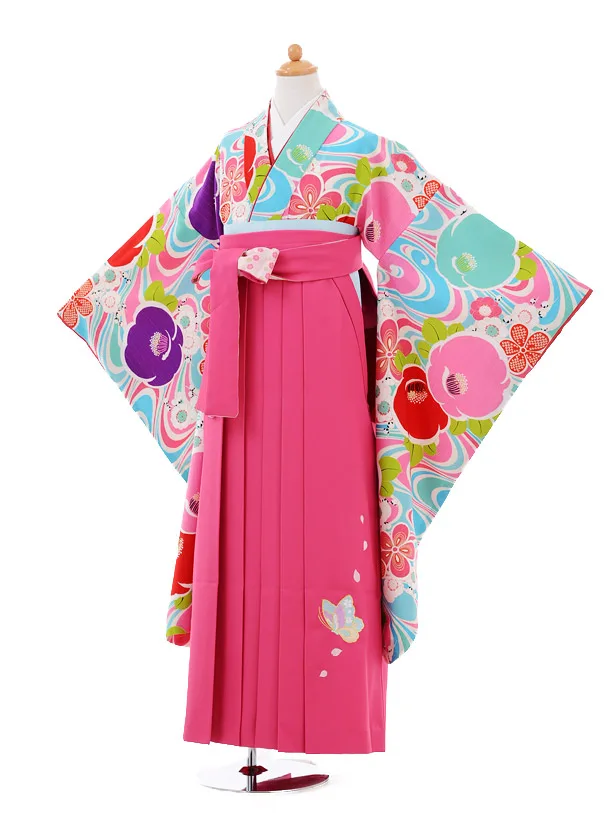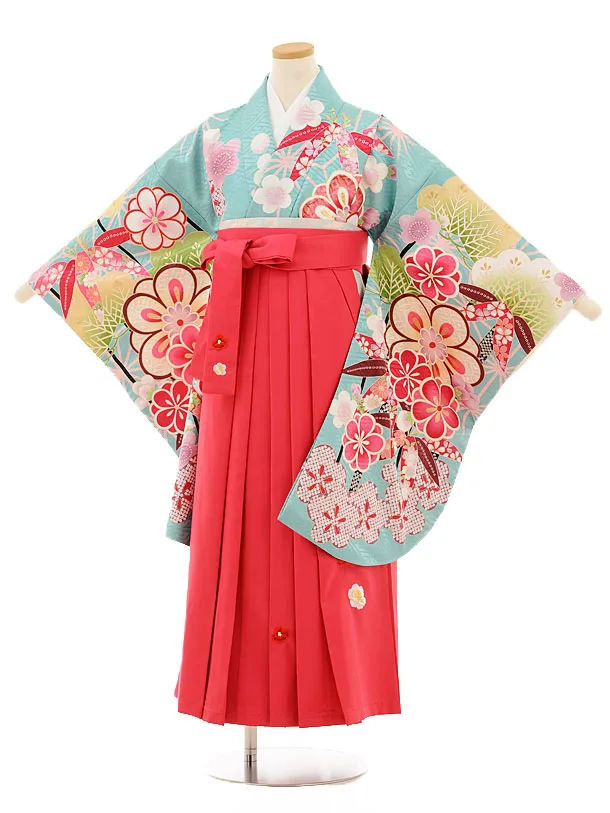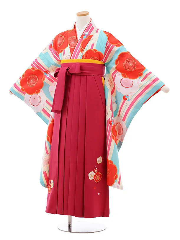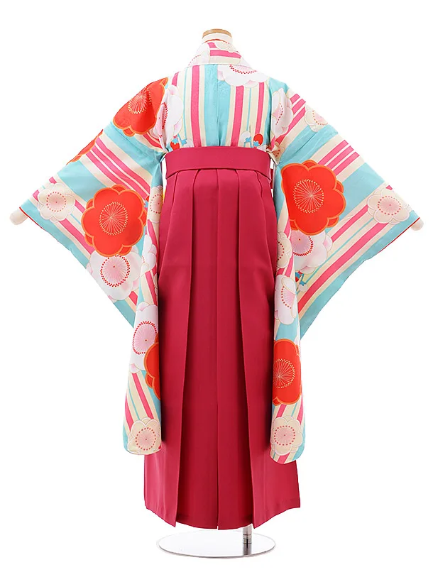 小学生 卒業袴 女児 Z003 水色 ストライプ 梅×ピンク袴