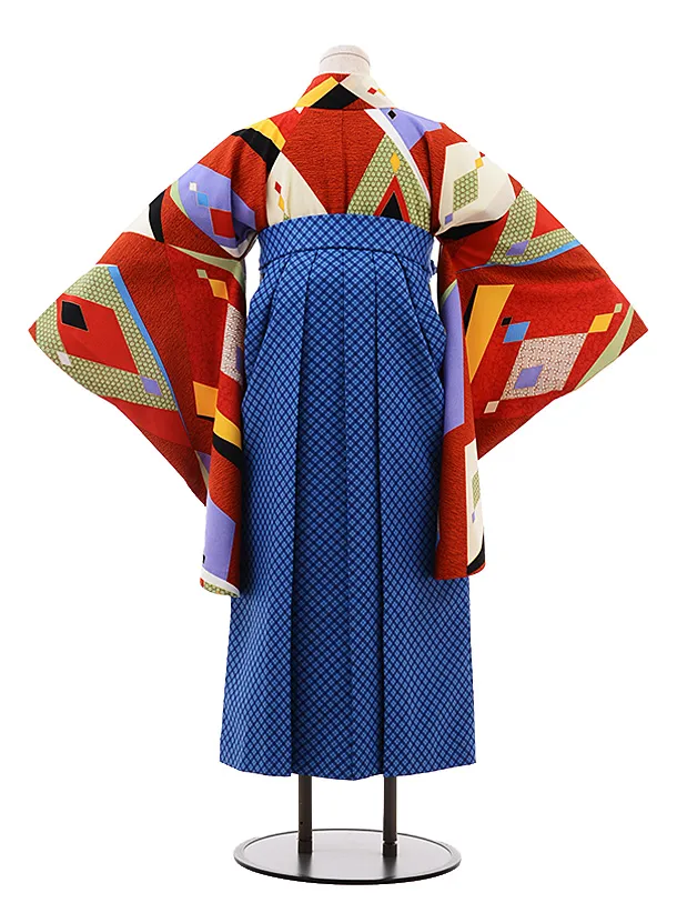 小学生卒業式袴レンタル(女の子) Z037赤地ダイヤ柄×ブルーチェック袴