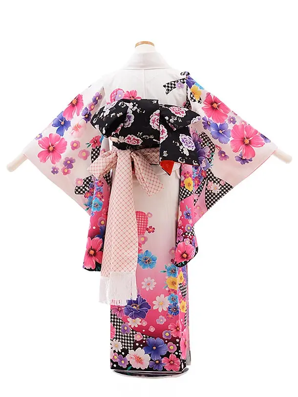 ジュニア着物 z079 白地 リボン 花 袋帯タイプ