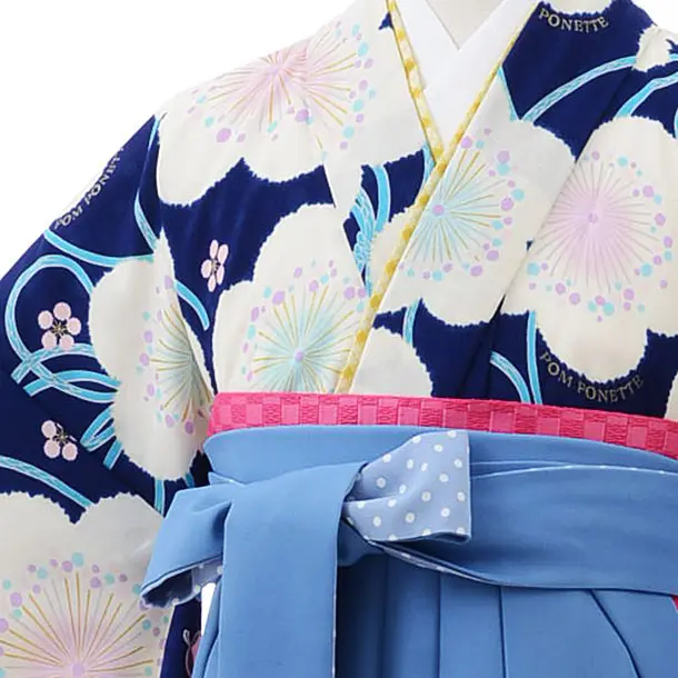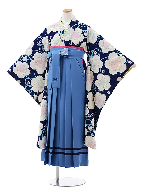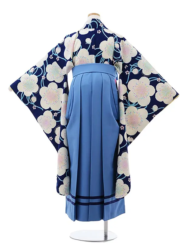 卒業袴レンタル Z093 ポンポネット 紺地 梅xブルー袴