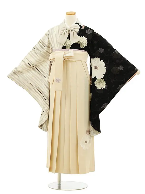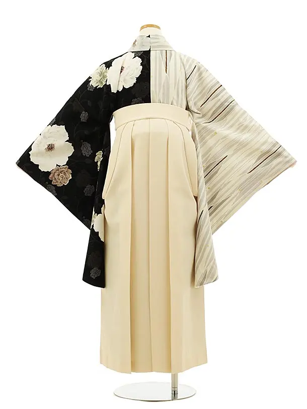 小学生袴Z184 JAPANSTYLEブラック/モカ片身替り薔薇矢絣xオフ白袴