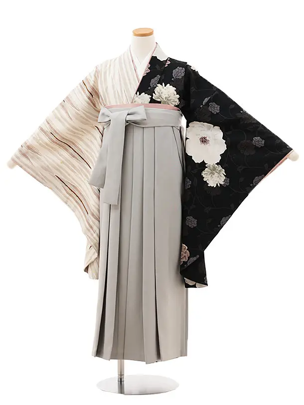 小学生卒業式袴 Z342オフ 黒片身替り薔薇矢絣xブルーグレー