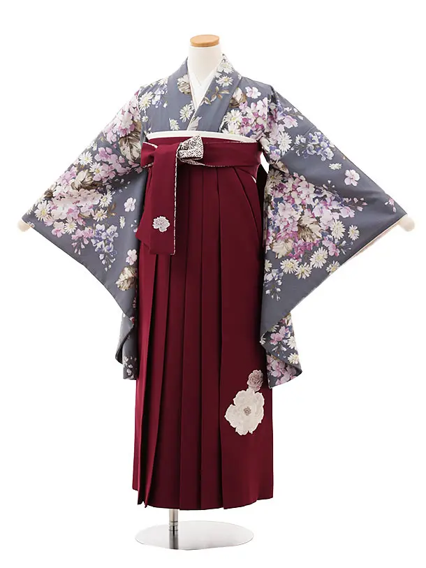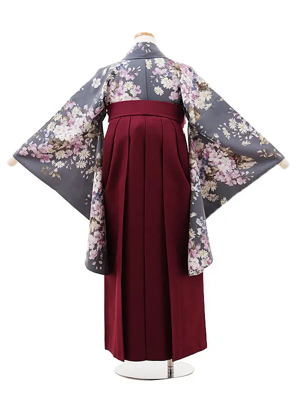 小学生卒業式袴レンタル(女の子) Z345 グレー小花ブーケ×ワイン