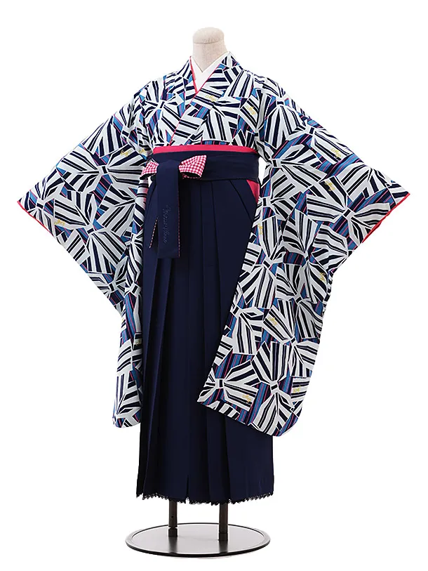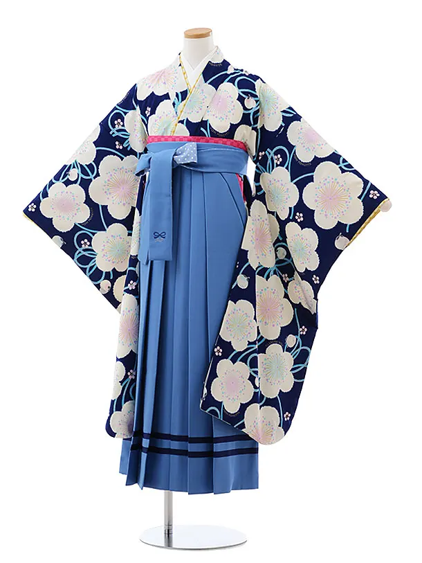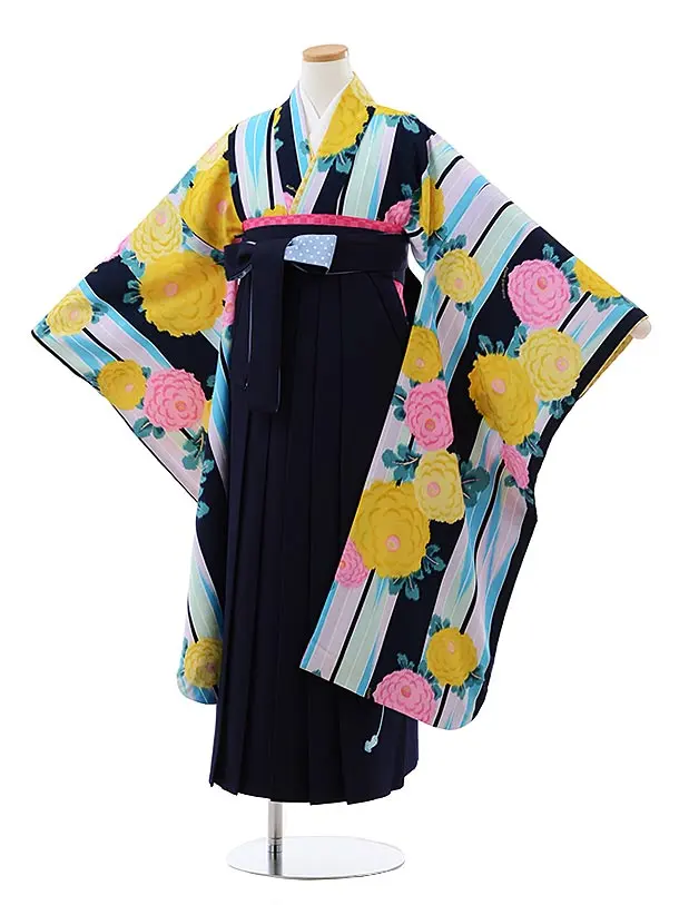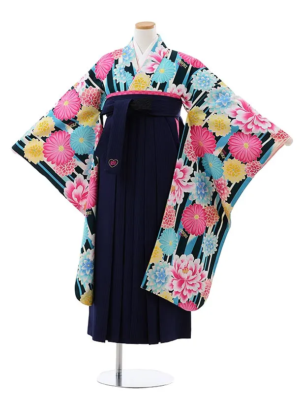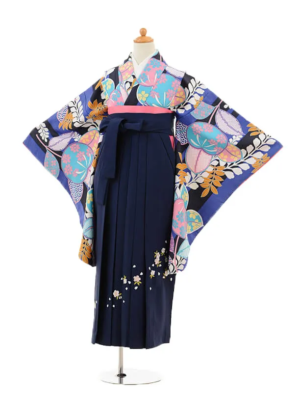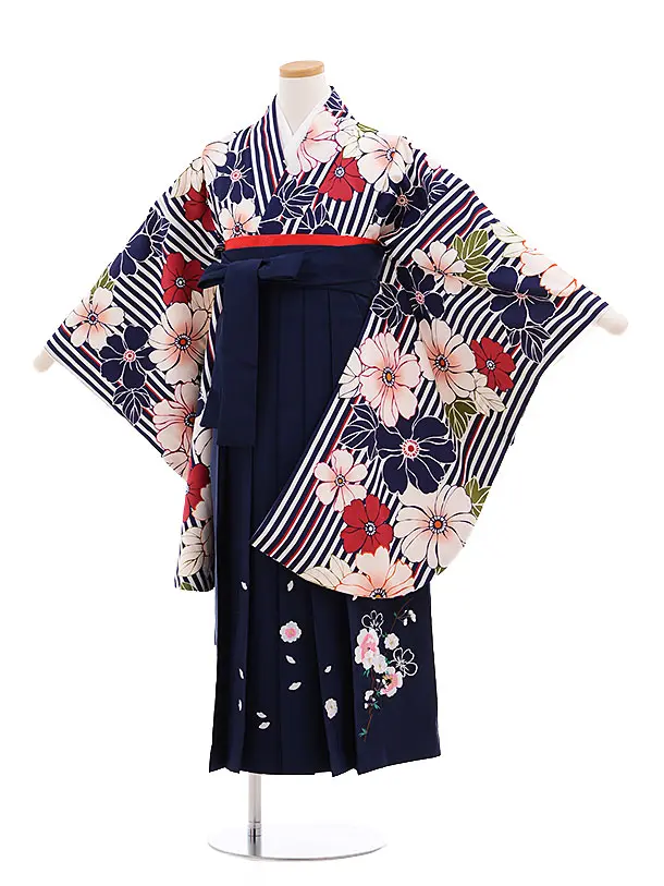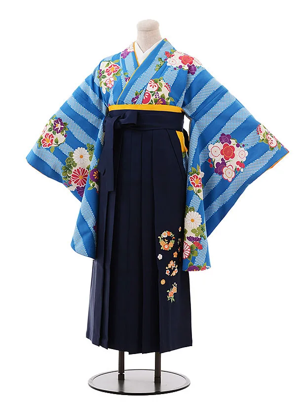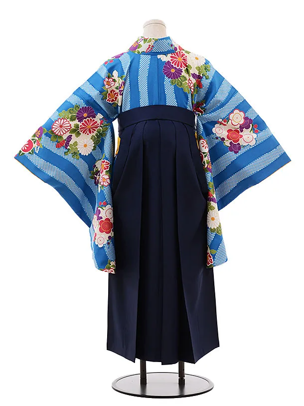 小学生卒業式袴レンタル(女の子) Z376 ブルーストライプ 花×紺袴