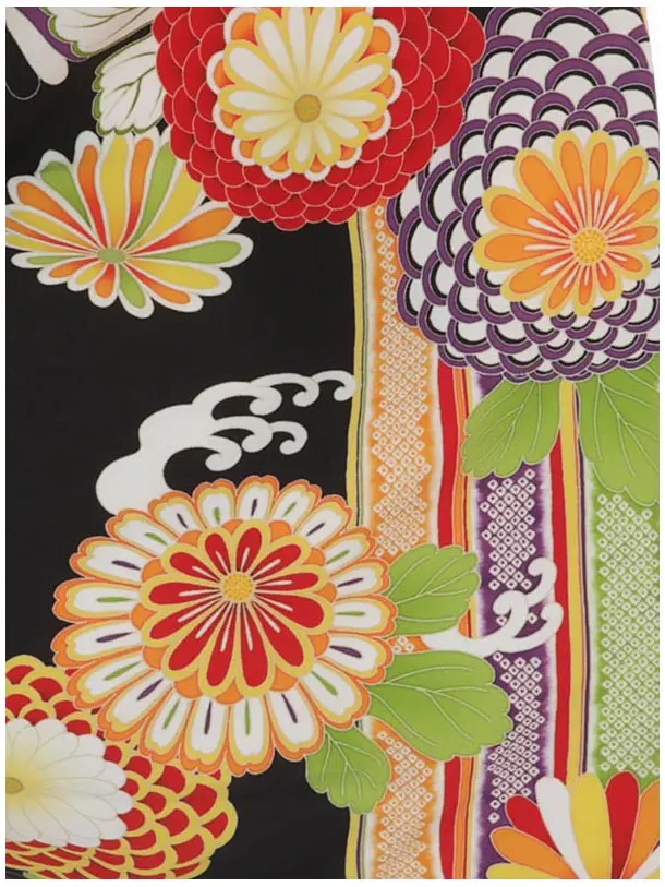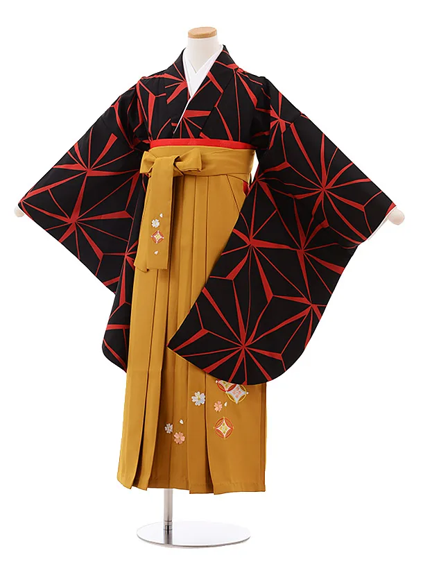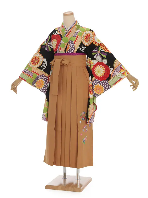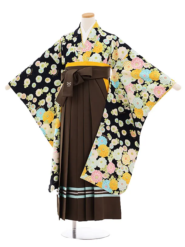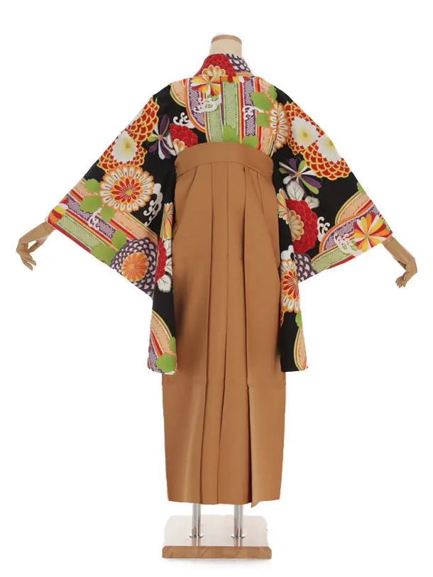 小学生卒業式袴レンタル(女の子) Z384 黒地 古典柄 x 茶袴