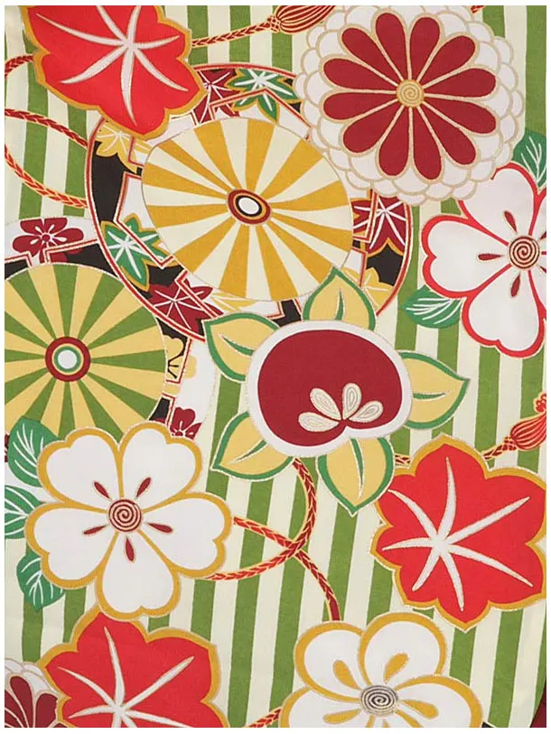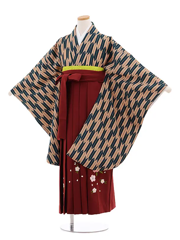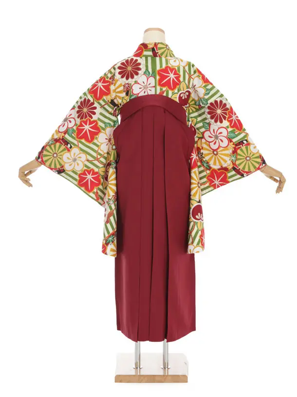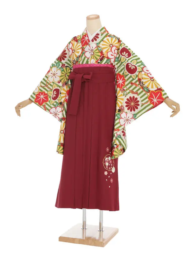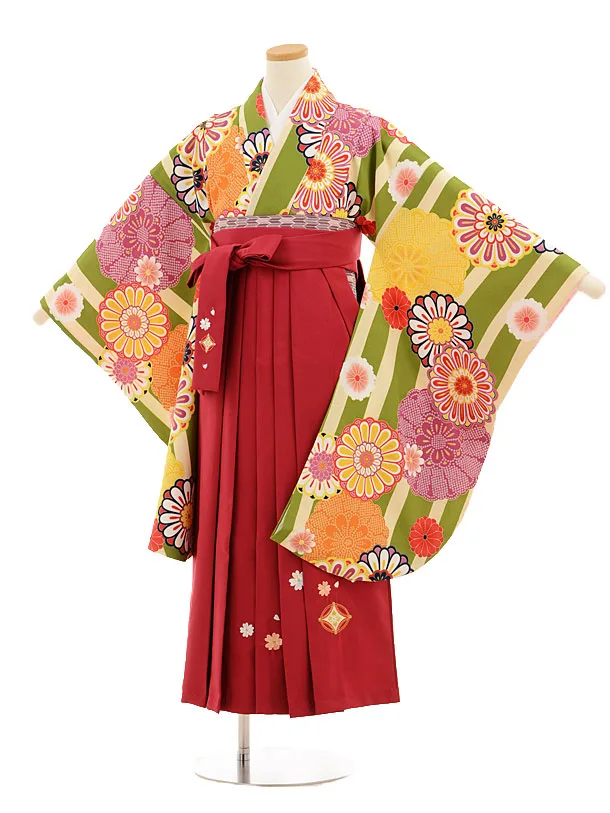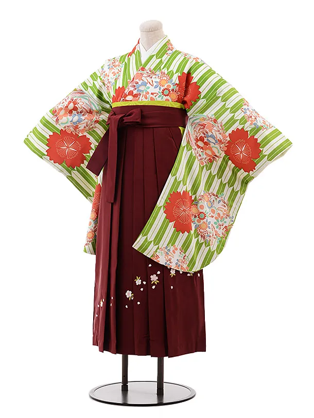 小学生卒業式袴(女の子) Z386 グリーン ストライプ x エンジ袴