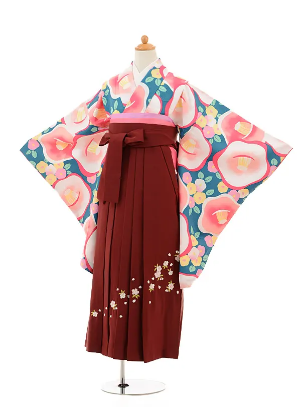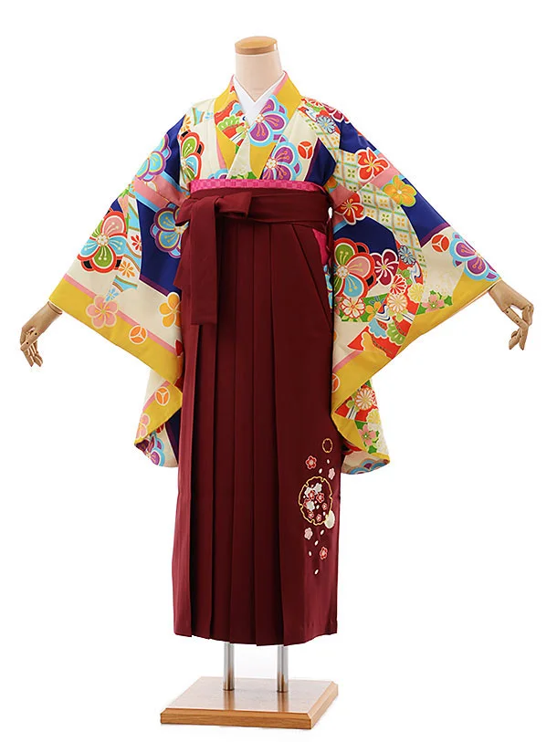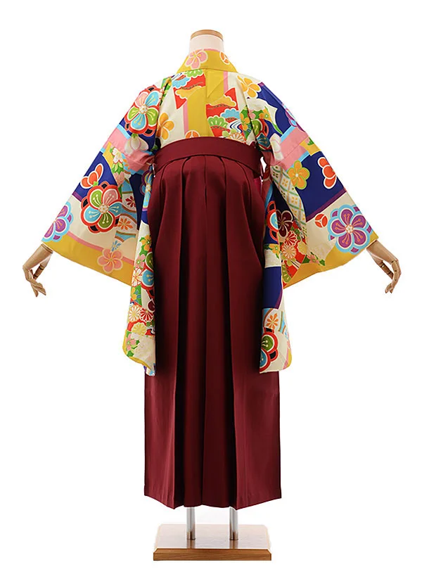 小学生卒業式袴レンタル(女の子) Z388ブルーきいろ梅×エンジ袴