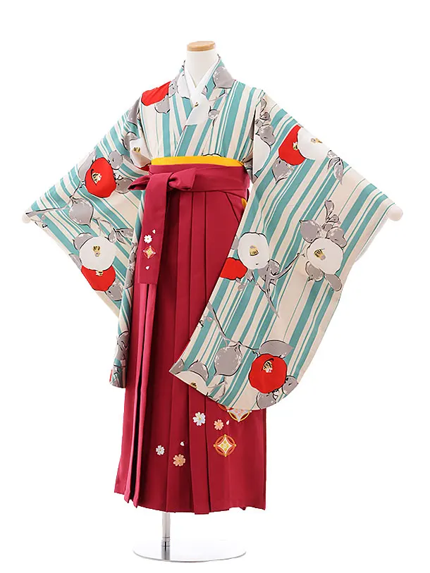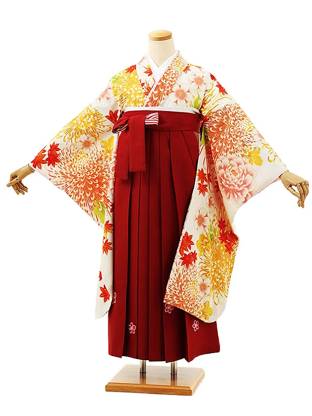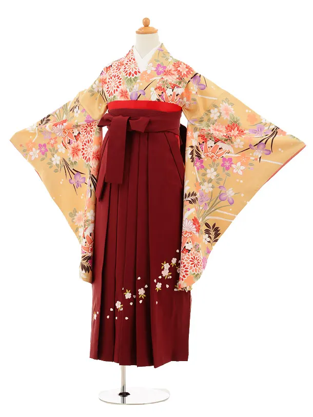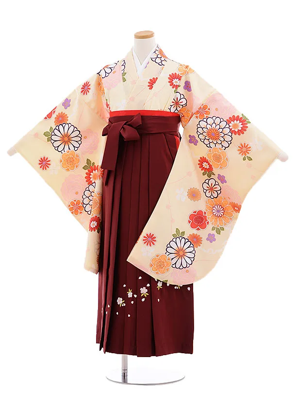 小学生卒業式袴(女の子) Z389 クリーム色地 菊椿 x エンジ袴