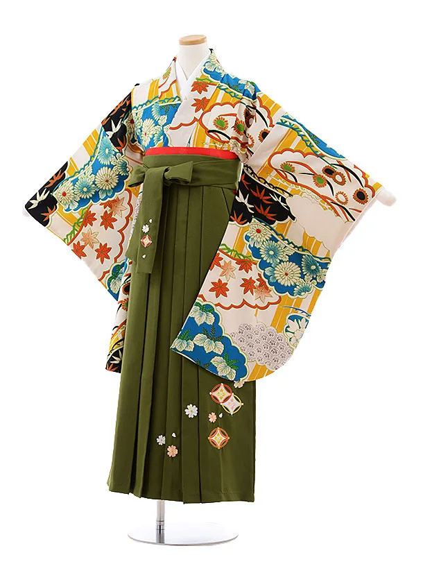 小学生卒業式袴(女の子) Z392 クリーム色地 なでしこ x グリーン袴