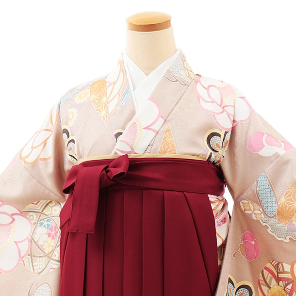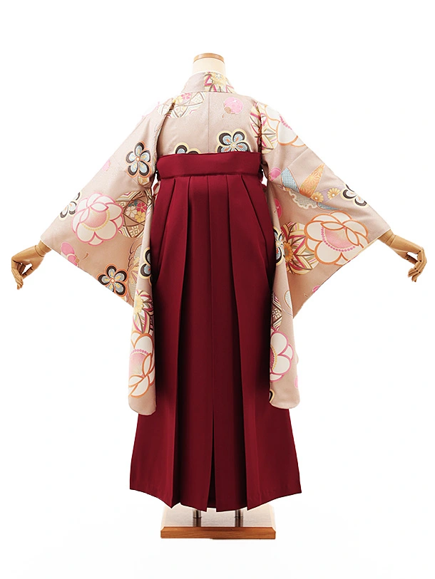 小学生卒業式略式袴(女の子) Z462 ベージュ 鞠に松竹梅×エンジ桜