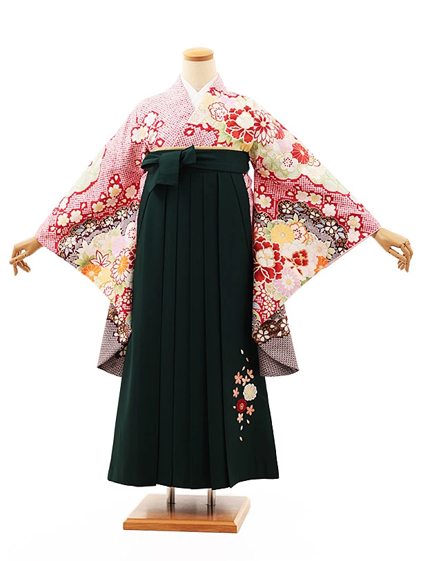 小学生卒業式略式袴(女の子) Z511 赤地疋田柄 牡丹花×グリーン桜