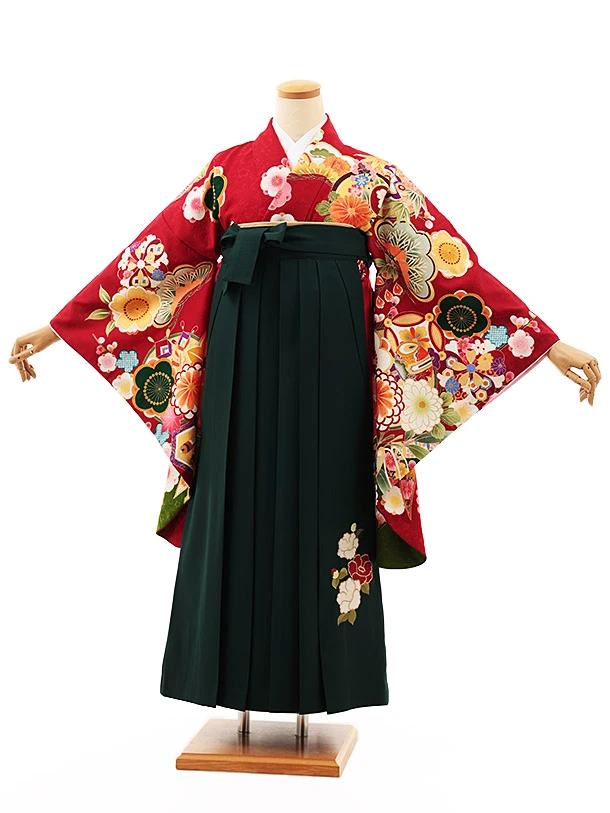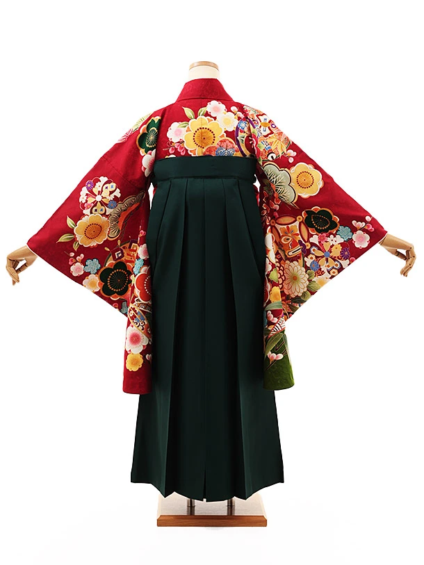 小学生卒業式かんたん袴(女の子) Z516 赤地 吉祥文様×グリーン椿