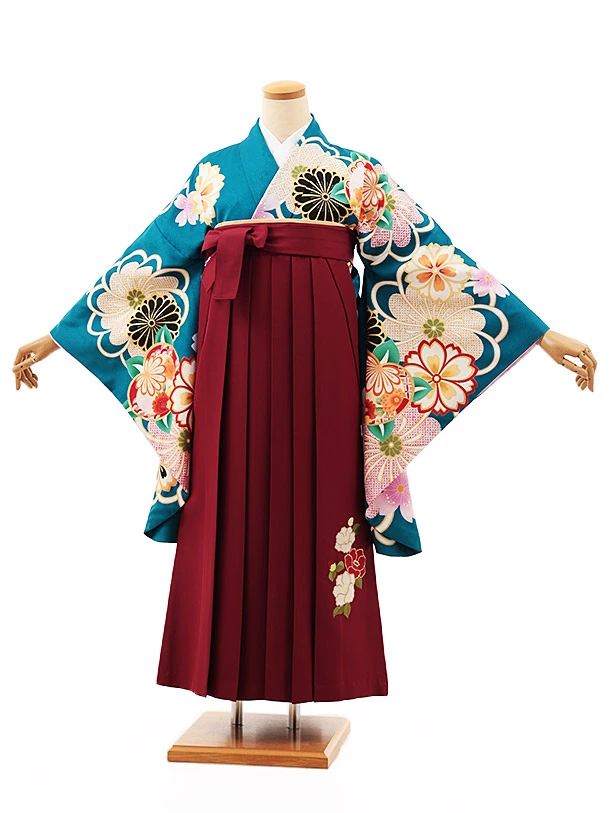 小学生卒業式略式袴(女の子) Z526 ターコイズ桜菊橘×エンジ椿