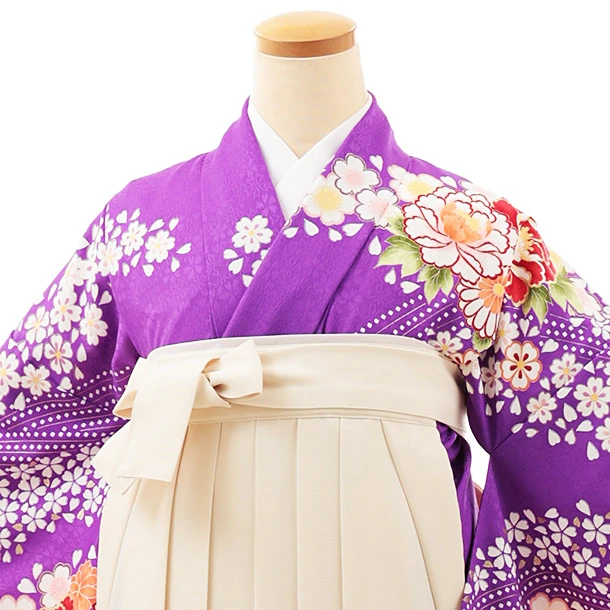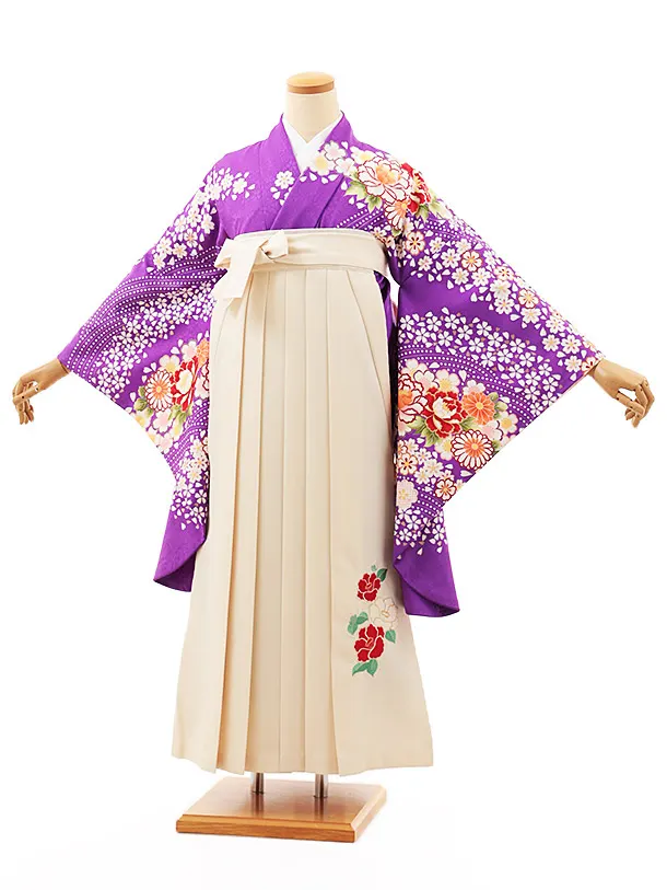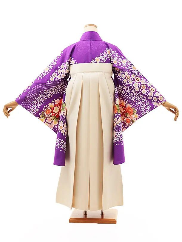 小学生卒業式略式袴(女の子) Z535 パープル牡丹桜流し×クリーム椿