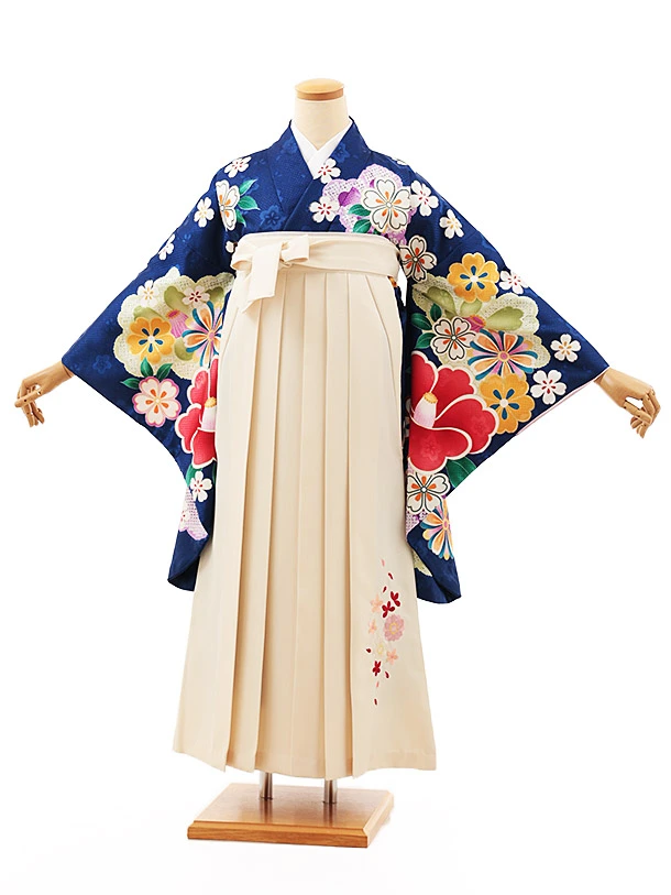 小学生卒業式略式袴(女の子) Z539 ブルー桜椿×クリーム桜