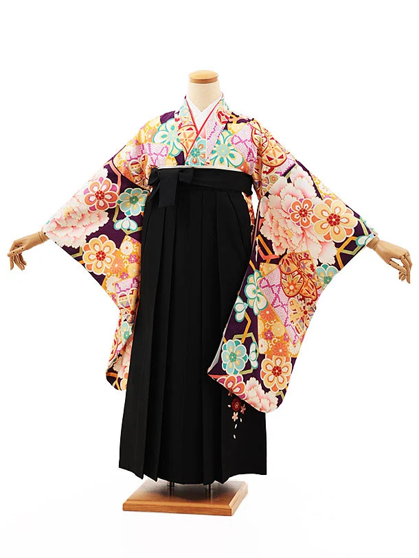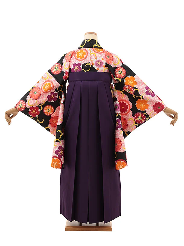 小学生卒業式略式袴(女の子) Z621 黒桜雲取り 花丸紋×紫椿