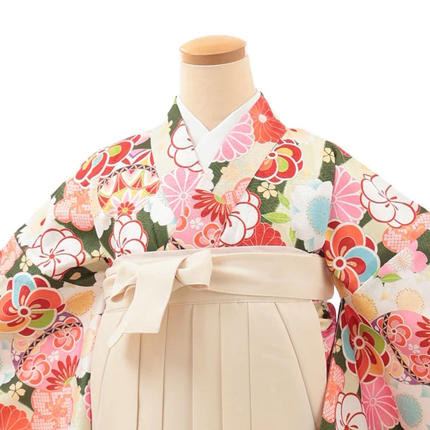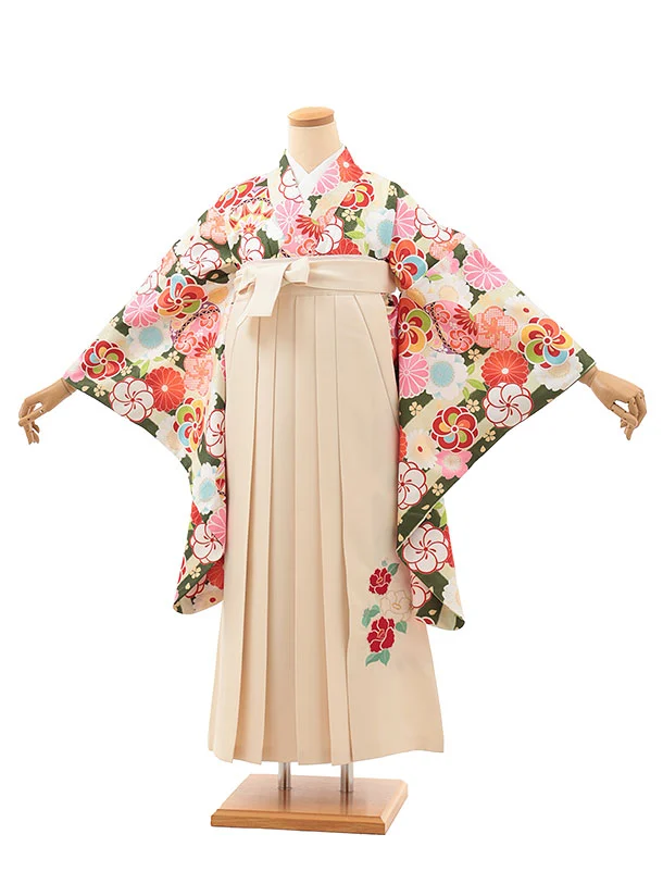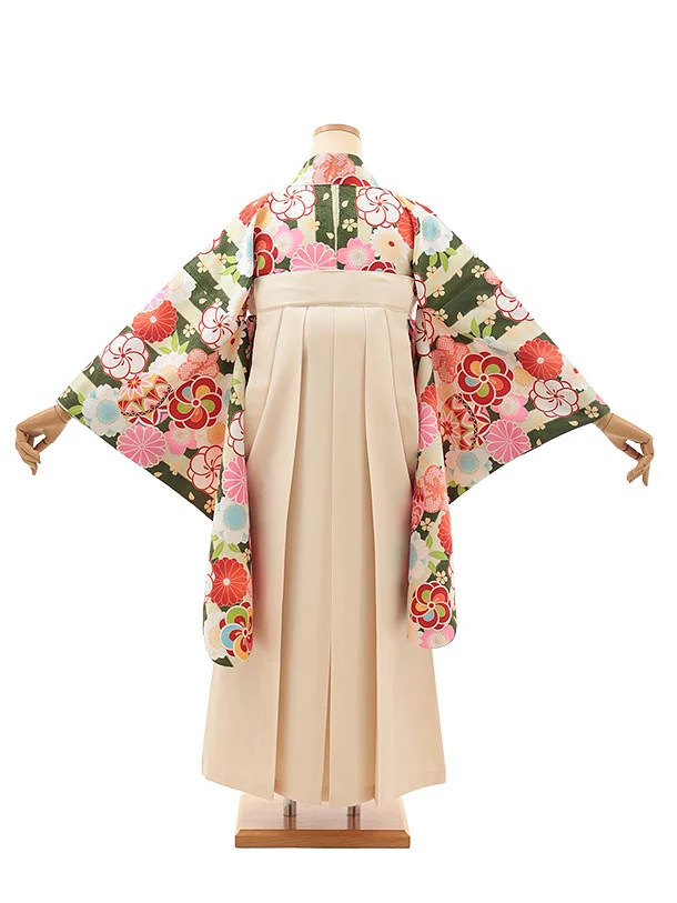 小学生卒業式略式袴(女の子) Z628 グリーンストライプ鞠花×クリーム椿