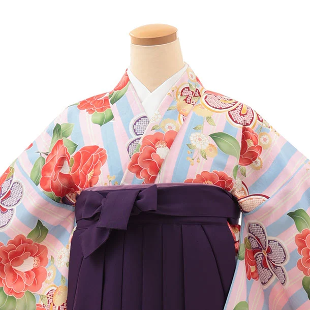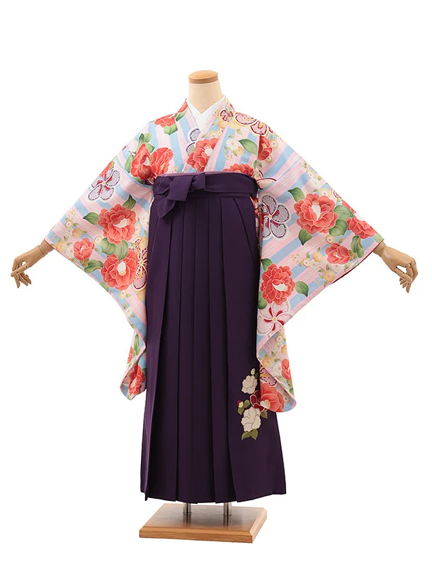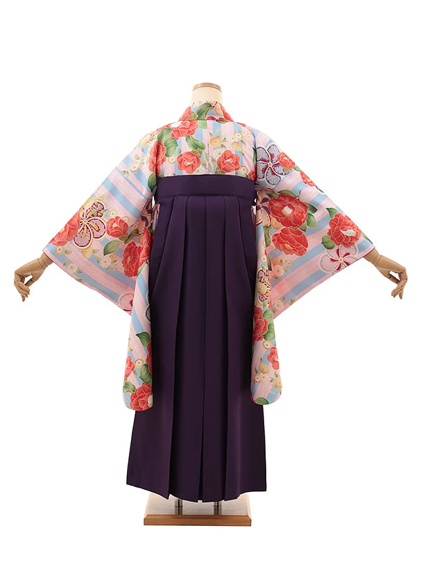 小学生卒業式略式袴(女の子) Z630 ピンクブルーストライプ椿×紫椿