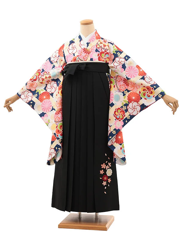 小学生卒業式略式袴(女の子) Z640 クリーム紺ストライプ×黒桜