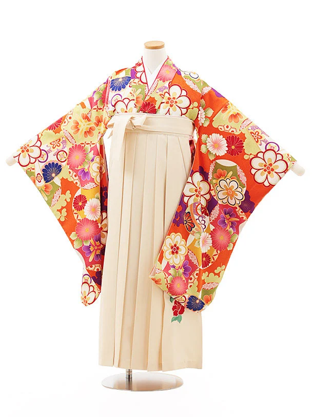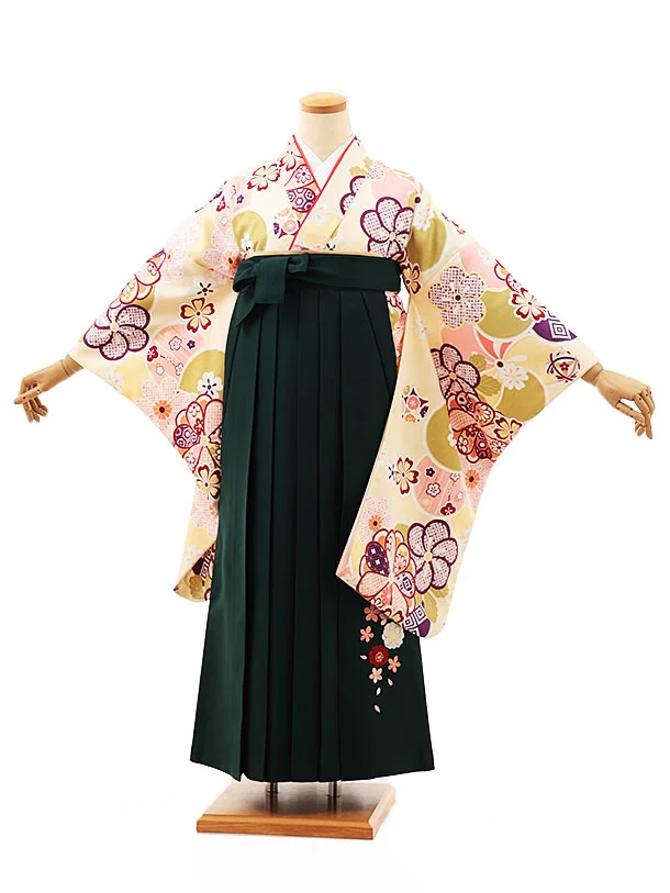 小学生卒業式略式袴(女の子) Z709 ベージュグレンチェック×エンジ桜