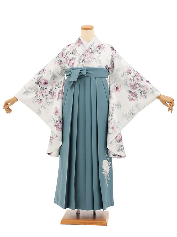 小学生卒業式かんたん袴(女の子) Z844 オフホワイトパステル花×ブルーグレー