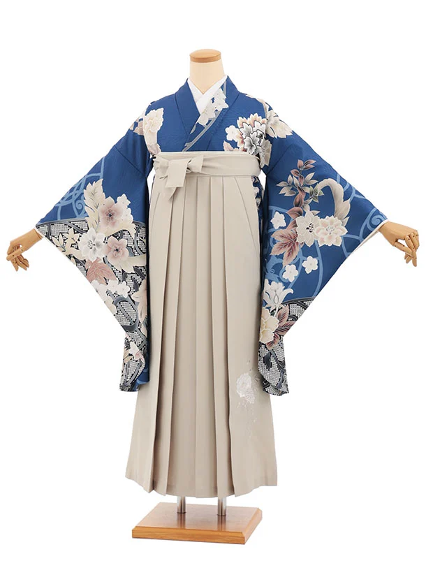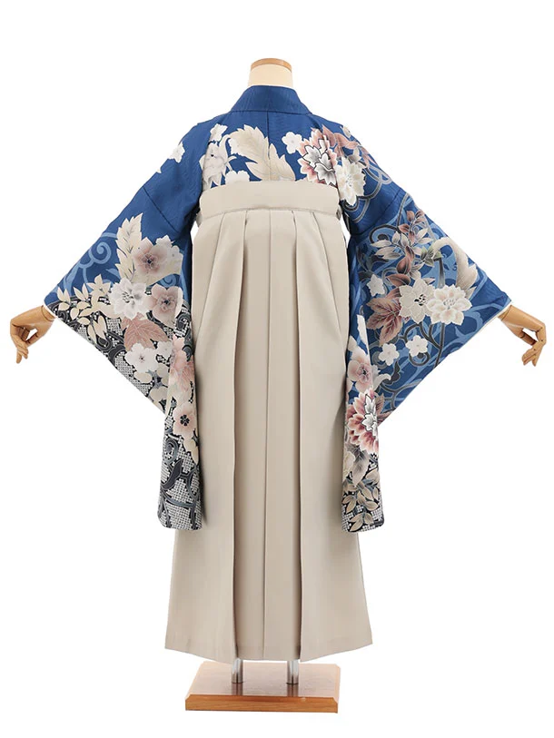 小学生卒業式かんたん袴(女の子) Z846 ブルー花×ベージュ
