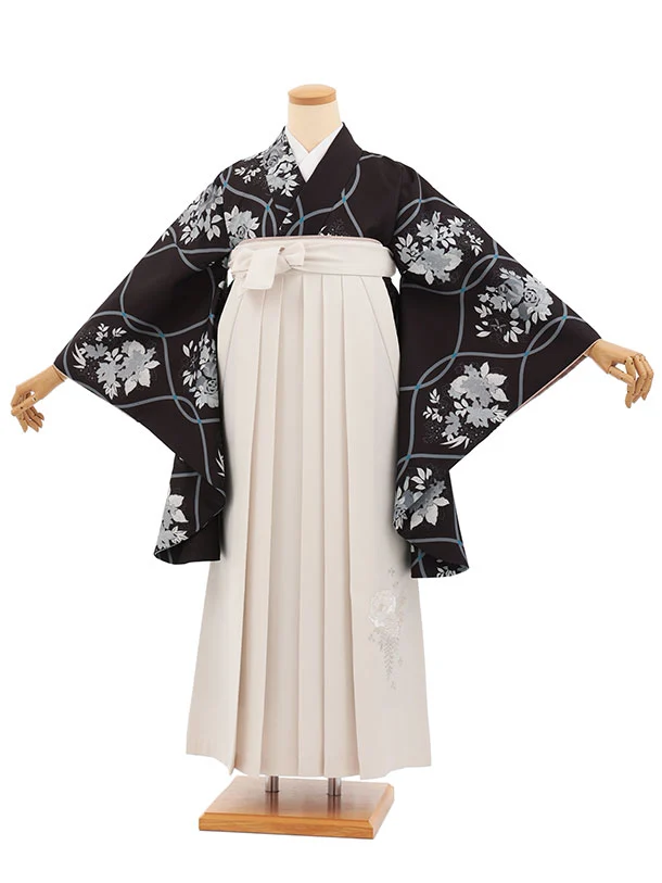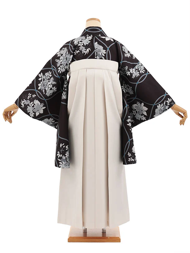 小学生卒業式かんたん袴(女の子) Z854 黒立桶に花×アイボリー