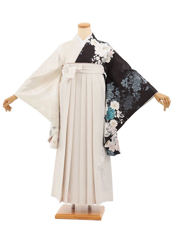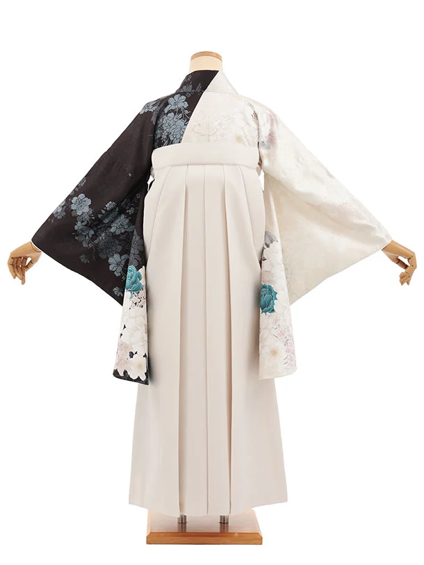 小学生卒業式かんたん袴(女の子) Z858 黒クリーム染め分け花×アイボリー