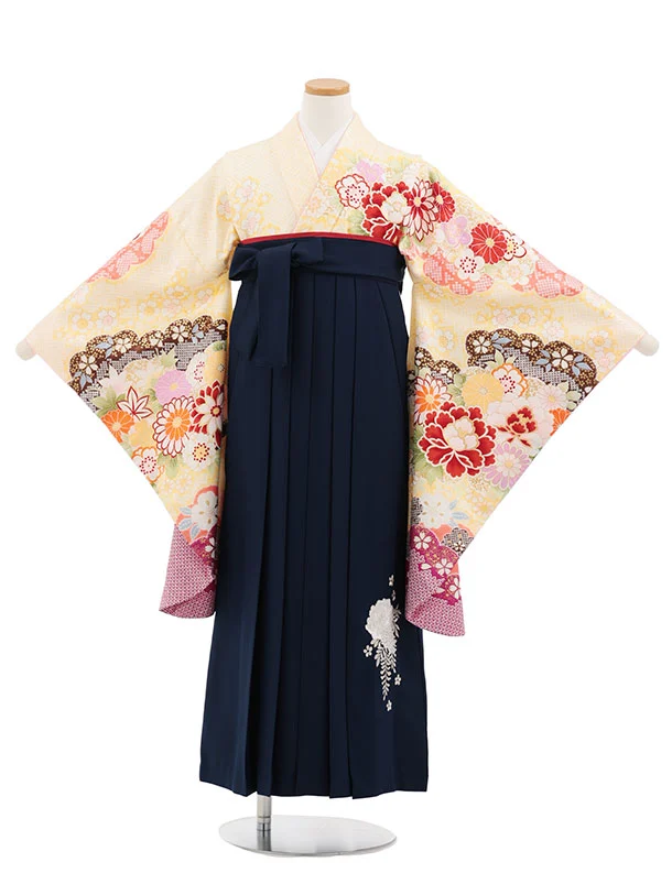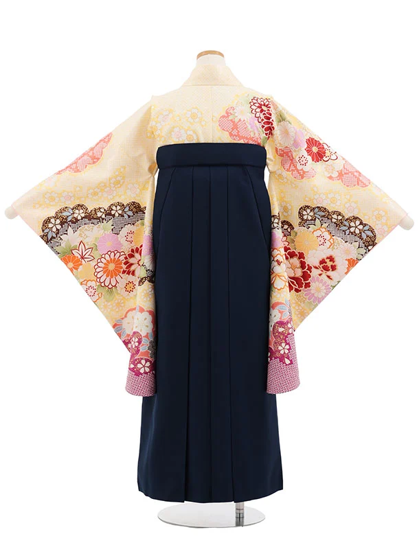 小学生卒業式かんたん袴(女の子) Z875 クリームイエロー疋田柄柄花×紺